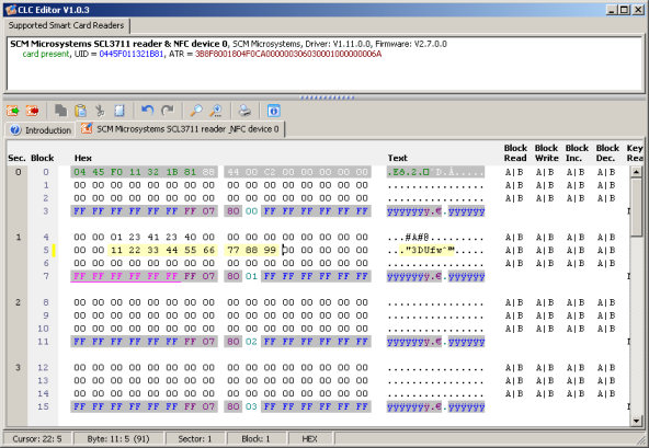 CLC Editor allows editing the content of MIFARE Classic and MIFARE Ultralight cards as well as compatible cards.